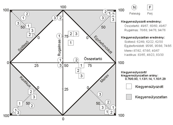 Az 1-es, 2-es, 3-as számok, a felvet tesztek sorszámai időrendben. Az "1, 2, 3 négyzet a férj, és az "1, 2, 3," kör a feleség értékeit jelöli a terápia különböző időpontjaiban. A kiegyensúlyozott skálákon és a kiegyensúlyozatlan skálákon egyaránt változások következtek be a funkcionálisabb családi működés irányába.