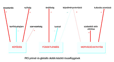A párklíma skálák alapvetően fontos jellemzője, hogy azoknak az állításoknak, amelyeket a kérdezett személyek a négyfokozatú válaszskálán ítélnek meg, a partnerkapcsolat szintjén kell mozogniuk. Az itemek megfogalmazásánál éppen ezért gondosan figyeltek arra, hogy az állítások ne én-központúak legyenek (például: "Boldog vagyok a kapcsolatomban."). Sőt, ami ennél több, az én-központúság elkerülése mellett a partnerközpontú megfogalmazásokat is mellőzték (például: "A párom nem hagy elég szabadságot."). A Párklíma Skála céljának, azaz a párkapcsolati síkon való vizsgálati szempontoknak megfelelően a fentiekkel ellentétben sokkal inkább a "mi" kérdését állítják a középpontba. Ennek szellemében az itemek többes szám harmadik személyben megfogalmazott kijelentéseket tartalmaznak, és bennük gyakran szerepelnek olyan kifejezések, mint a "kapcsolatunkban" és a "nálunk" (például: "Kapcsolatunkban gyakran kerül szóba.", vagy "Nálunk otthon gyakrabban előfordul." ). Azért is különösen hangsúlyos ez a Párklíma Skála nyelvhasználatában, hiszen a skála egyik alapgondolata, hogy a kapcsolaton belüli hangulat mindkét partneren egyaránt múlik. Mint már említettük, a Párklíma Skála hosszabb változata, az 54 itemes PKS kilenc primer skálát foglal magába, míg a 24 itemes PKS-R három globális skálát. Az utóbbit faktoranalízis segítségével nyerték a primer skálákból, ezáltal vált lehetővé a párklíma központi aspektusainak ökonomikus módon történő összefoglalása. A primer és a globális skálák közötti összefüggéseket szemlélteti a következő ábra. |